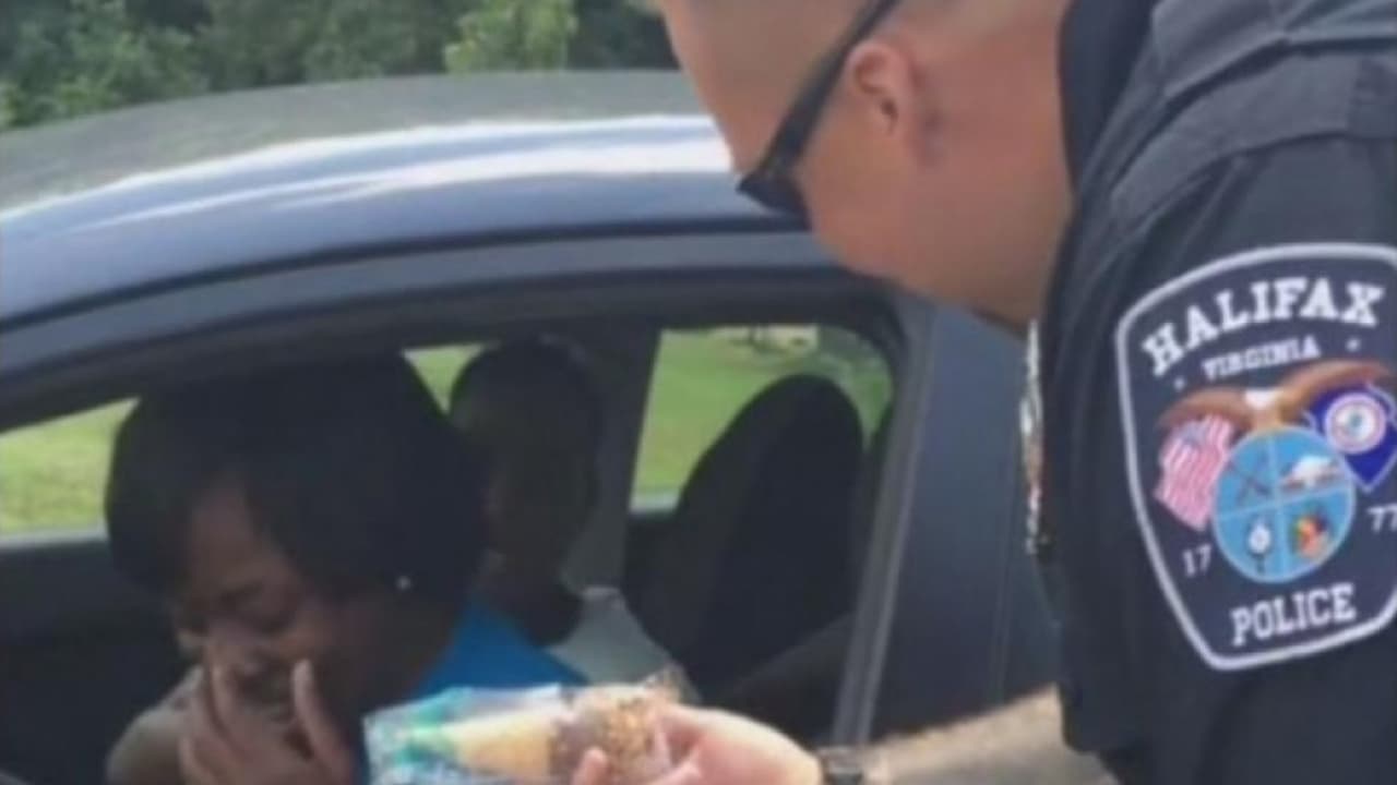 En un video que se convirtió en viral en las redes sociales, dos policías de Halifax, Virginia detienen a una conductora para ofrecerle un helado durante un día caluroso.