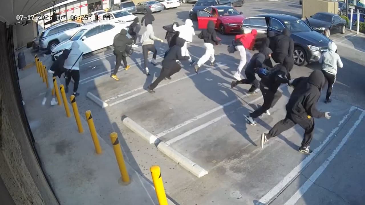 Cámaras de seguridad captaron el momento en que una turba de entre 15 y 20 personas encapuchadas intentó irrumpir en una joyería en California. Al darse cuenta de lo que ocurría, el dueño sacó su arma y la disparó, logrando ahuyentar a los delincuentes.