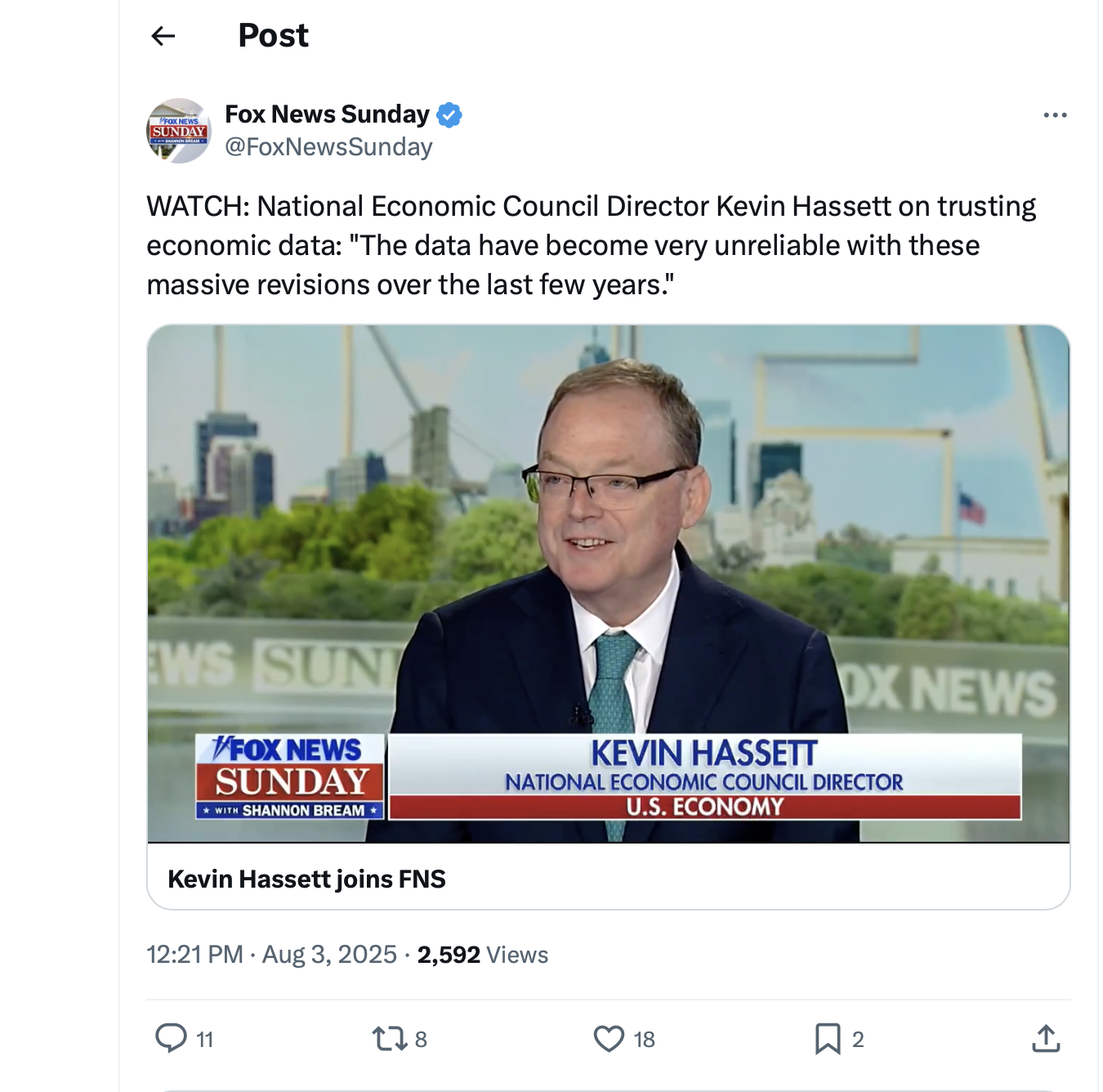 Sin embargo, la confiabilidad de los datos es cuestionada. Kevin Hassett, director del Consejo Económico Nacional (National Economic Council, NEC), un organismo creado en 1993 durante la administración de Bill Clinton para asesorar al presidente de turno en temas económicos, dijo que los datos "se han vuelto muy poco confiables con estas enormes revisiones de los últimos años", en una entrevista con Fox News Sunday. Explicó que, si bien las revisiones en los datos de empleo no son inusuales, estas comenzaron a hacerse más pronunciadas durante la pandemia, cuando era comprensible que las encuestas no siempre se completaran dado el contexto.