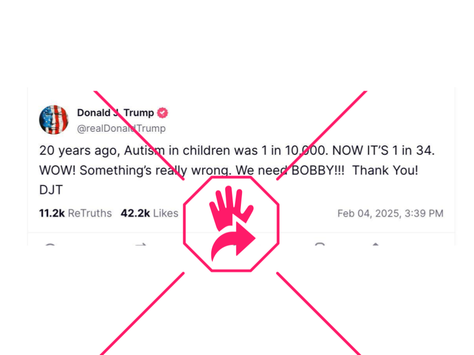 “Hace 20 años el autismo infantil era de 1 por cada 10,000. Ahora es 1 de cada 34. Vaya, algo va realmente mal. Necesitamos a Bobby [Robert F. Kennedy Jr.]...”, escribió Trump en Truth Social, su red social. A su afirmación le falta contexto porque si bien el número de niños dentro del Trastorno del Espectro Autista (TEA) es cercano al que dio Trump: 1 de cada 36 niños, según la Red de Monitoreo del Autismo y las Discapacidades del Desarrollo (ADDM, por sus siglas en inglés) de los Centros para el Control y la Prevención de Enfermedades (CDC, por sus siglas en inglés), lo que omitió el republicano es que, en relación a hace 20 años, se conoce más sobre la condición y por ende hay más detección.