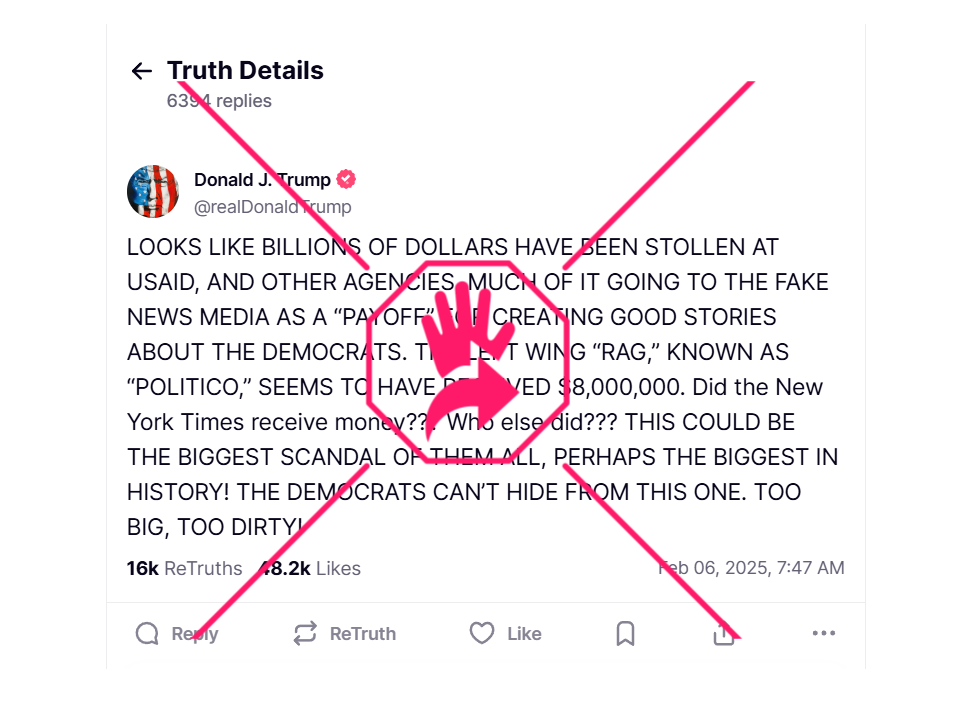 “Parece que miles de millones de dólares han sido robados a USAID [Agencia de Estados Unidos para el Desarrollo Internacional] y otras agencias, gran parte de ellos destinados a los medios de noticias falsas como 'pago' por crear buenas historias sobre los demócratas. El 'periodicucho' de izquierdas, conocido como Politico, parece haber recibido 8,000,000 de dólares. ¿Recibió dinero The New York Times?...”, escribió Trump este 6 de febrero de 2025, en su perfil de Truth Social.