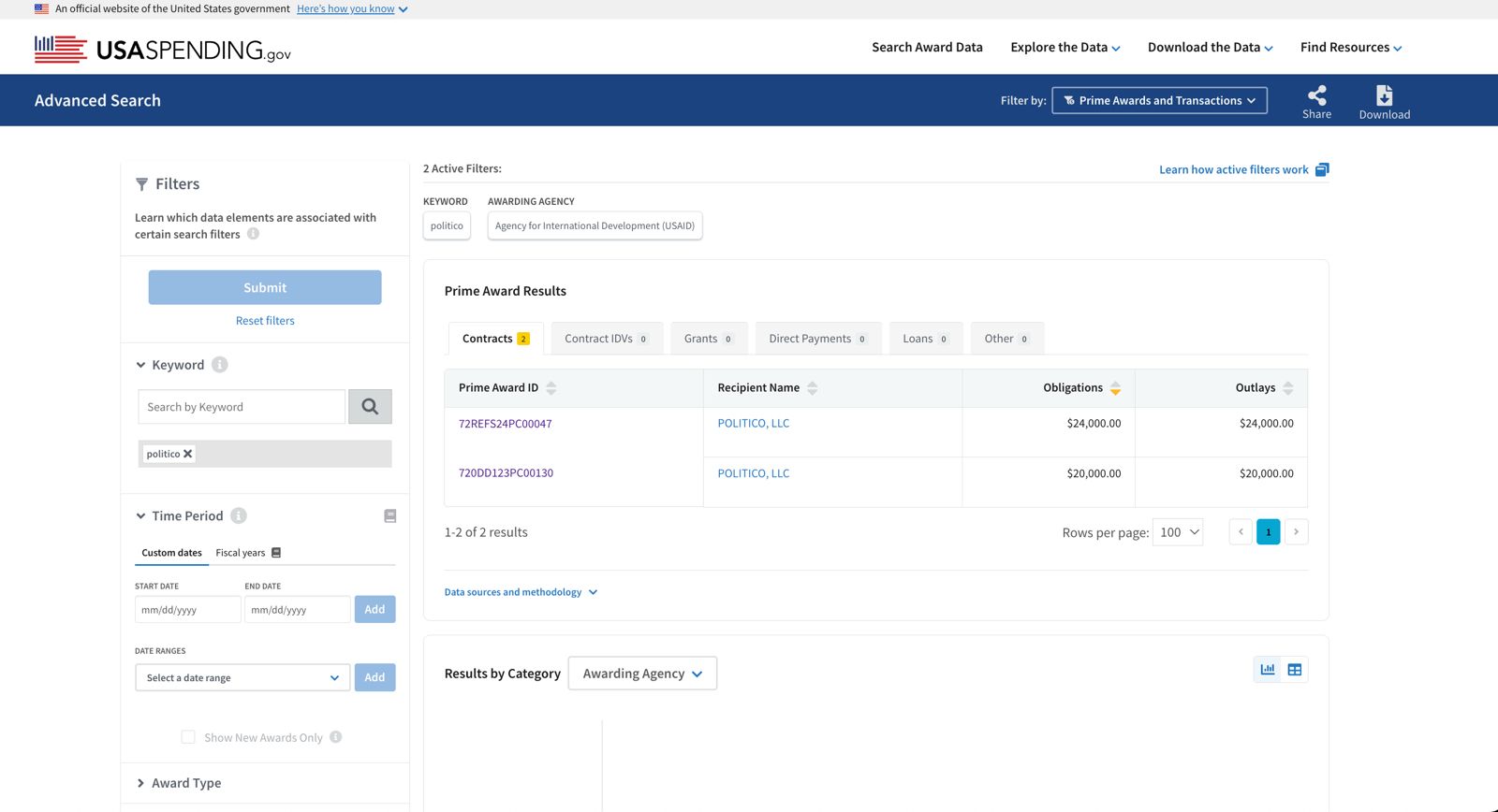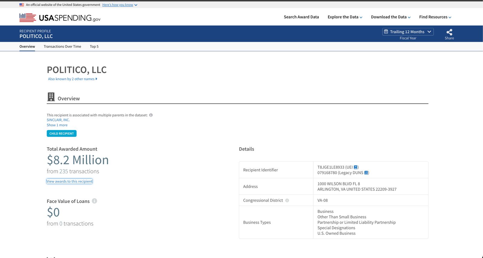 En una revisión de USAspending.gov, Politico aparece con un gasto de 8.2 millones en los últimos 12 meses, adjudicado en diferentes contratos de suscripciones editoriales, no solo con la USAID, sino con otros departamentos o agencias federales como, por ejemplo, el Departamento de Salud, el de Interior o el de Energía, según se pueden ver en los detallados al hacer una búsqueda pormenorizada. Las transacciones en la línea del tiempo muestran que esto no es inusual, pues a partir de 2016 ya hubo contrataciones de sus servicios que fueron registradas en esta web.