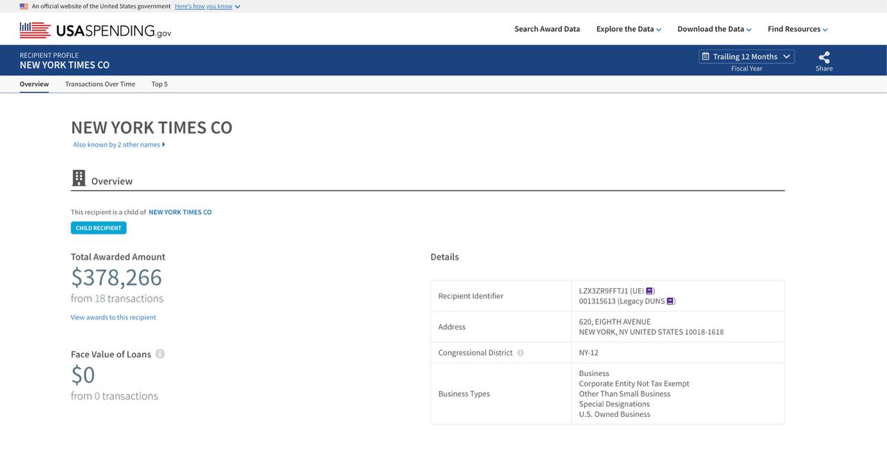 Al hacer la búsqueda en USAspending.gov con los ingresos recibidos por TNYT, encontramos que en los últimos 12 meses fueron de 378,266 dólares. Al igual que con Politico, la mayoría de los pagos de diversos departamentos gubernamentales son por la suscripción a sus servicios informativos. Por ejemplo, la Oficina del Servicio Fiscal del Departamento del Tesoro pagó la suscripción, tanto por el servicio digital como por el de entrega en papel, de TNYT de junio de 2014 al mismo mes de 2019. El monto total fue de algo más de 80,000 dólares.