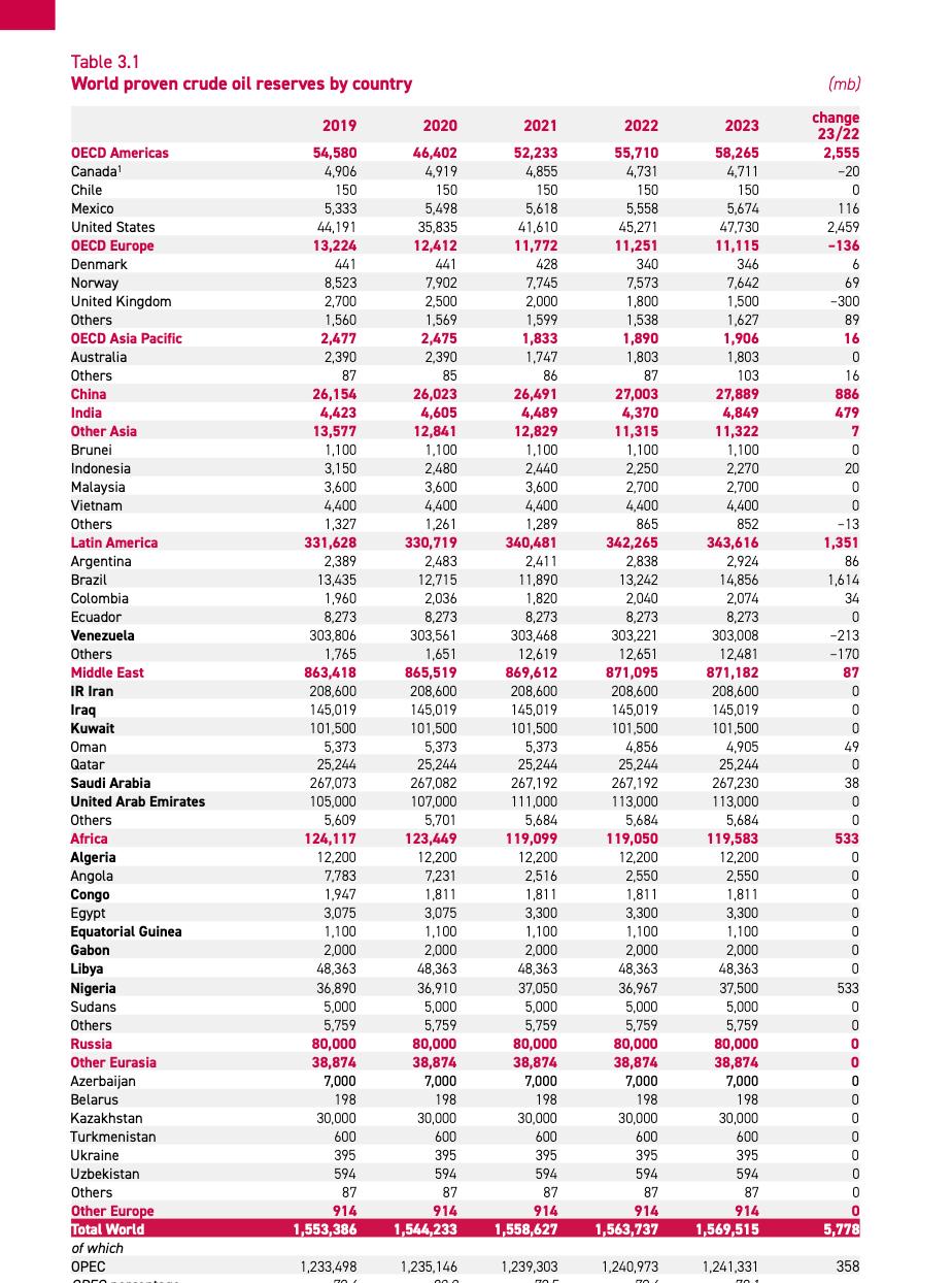 Para 2023, la lista de mayores reservas de petróleo la encabezaba, un año más, como recoge el Boletín Anual Estadístico 2024 de la OPEP, Venezuela, con unas reservas de 303,008 millones de barriles (mb), seguida de Arabia Saudita con 267,230 mb, Irán con 208,600 mb, Irak con 145,019 mb, Emiratos Árabes Unidos con 113,000 mb y Kuwait con 101,500 mb.