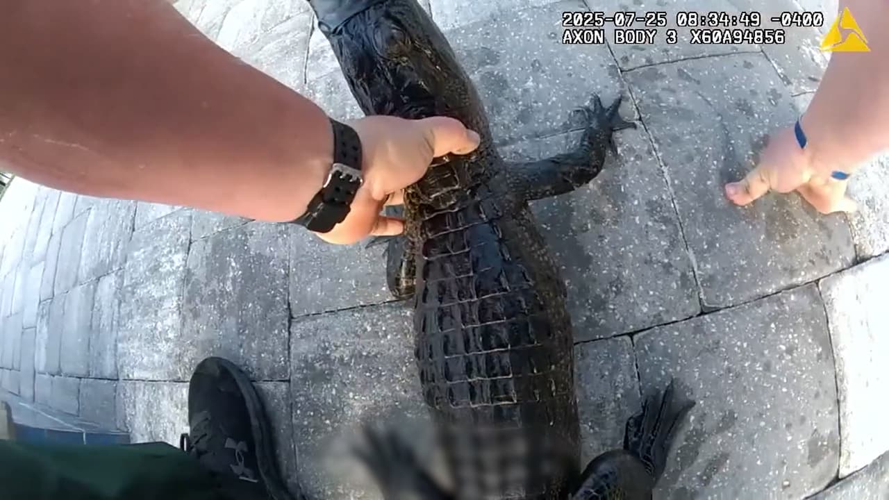 Un agente de la Oficina del Sheriff del Condado de St. Johns, en Florida, grabó el momento en que acude a sacar a un caimán que nadaba en la piscina de una casa. El oficial lo retira con sus propias manos y lo traslada en su patrulla. Más información en