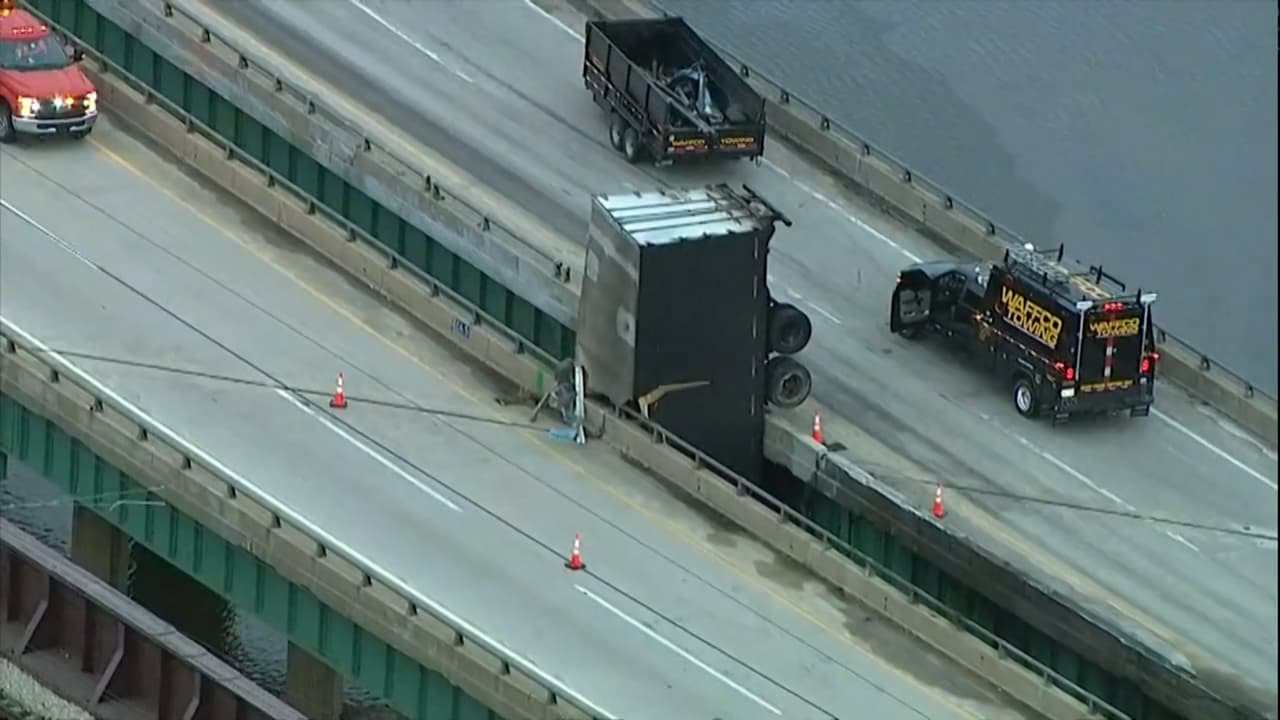 El camión de carga chocó contra la barrera y quedó apuntando directamente hacia el río Calumet en Indiana. El chofer fue rescatado tras trepar de la cabina a un pilar del puente. Buzos se sumergieron para ayudar a asegurar el camión.