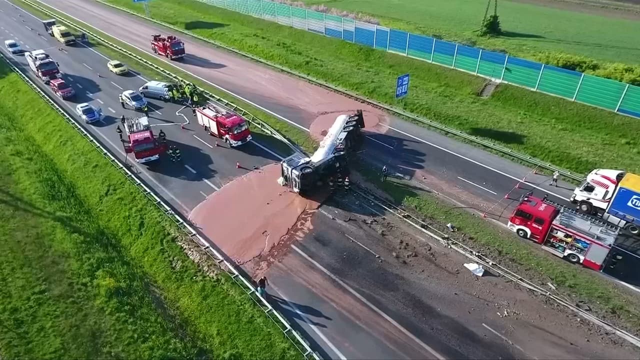 Un camión se voltea en medio de la carretera y la inunda de chocolate