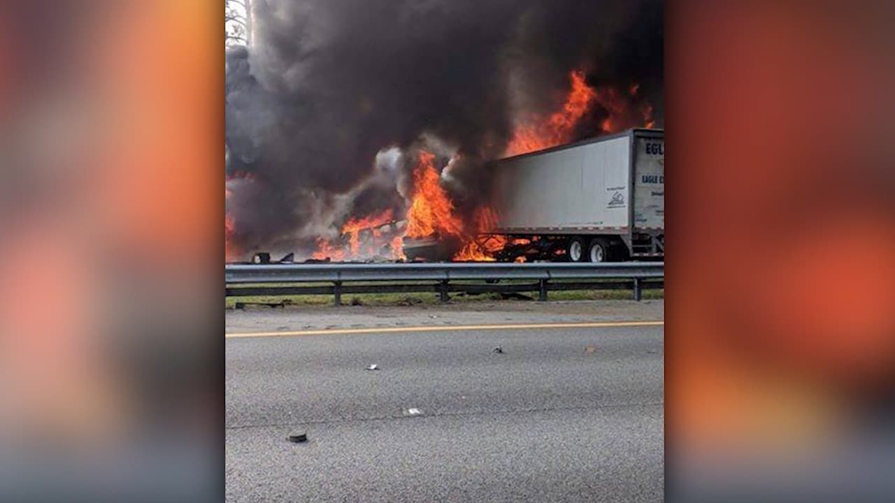Dos camiones de carga colisionaron en la carretera interestatal 75 con dos vehículos de pasajeros, uno de ellos una camioneta que transportaba a un grupo de niños a Disney World. El incendio, provocado por un derrame de combustible, obligó a cerrar la carretera.