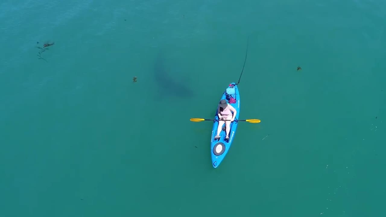 Un dron capta el momento en que un tiburón nada alrededor de un kayak en California
