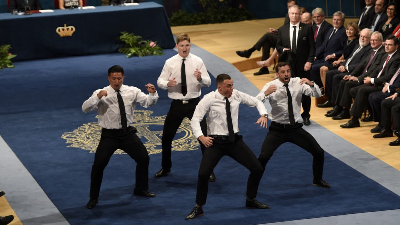 Los cuatro miembros del equipo de rugby 'All Blacks' han sorprendido a los reyes de España tras recibir el galardón de los Premios Princesa de Asturias con una tradicional haka.