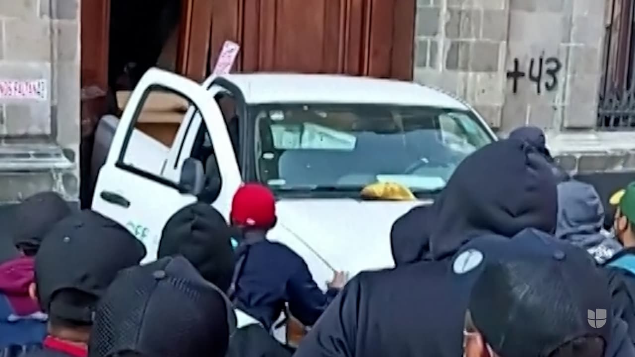 Un grupo que protestaba por la desaparición de 43 estudiantes de Ayotzinapa, en México, derribó la puerta del Palacio Nacional de México con una camioneta mientras sucedía la conferencia mañanera del presidente Andrés Manuel López Obrador.