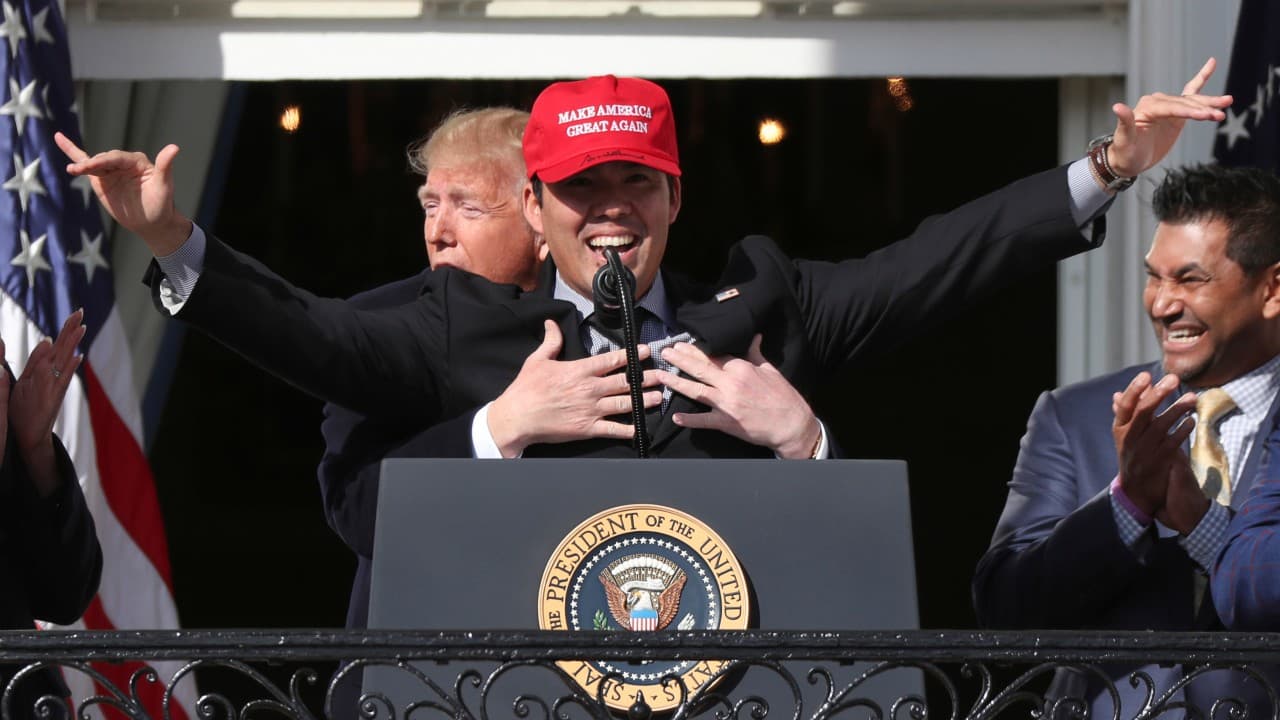 Un jugador de los Nacionales celebra junto a Trump el título con una gorra de 'MAGA'
