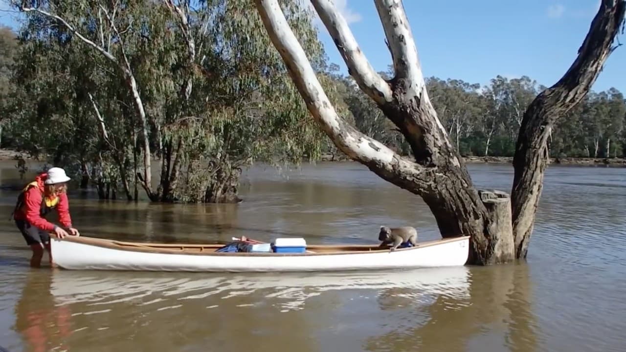 Un koala varado en un río acepta de buena gana subirse a una canoa y ser llevado a la orilla