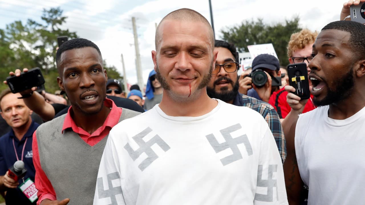 Este autodenominado ‘cabeza rapada nazi’ caminó entre una multitud mientras protestaban contra el nacionalista blanco Richard Spencer el pasado jueves.