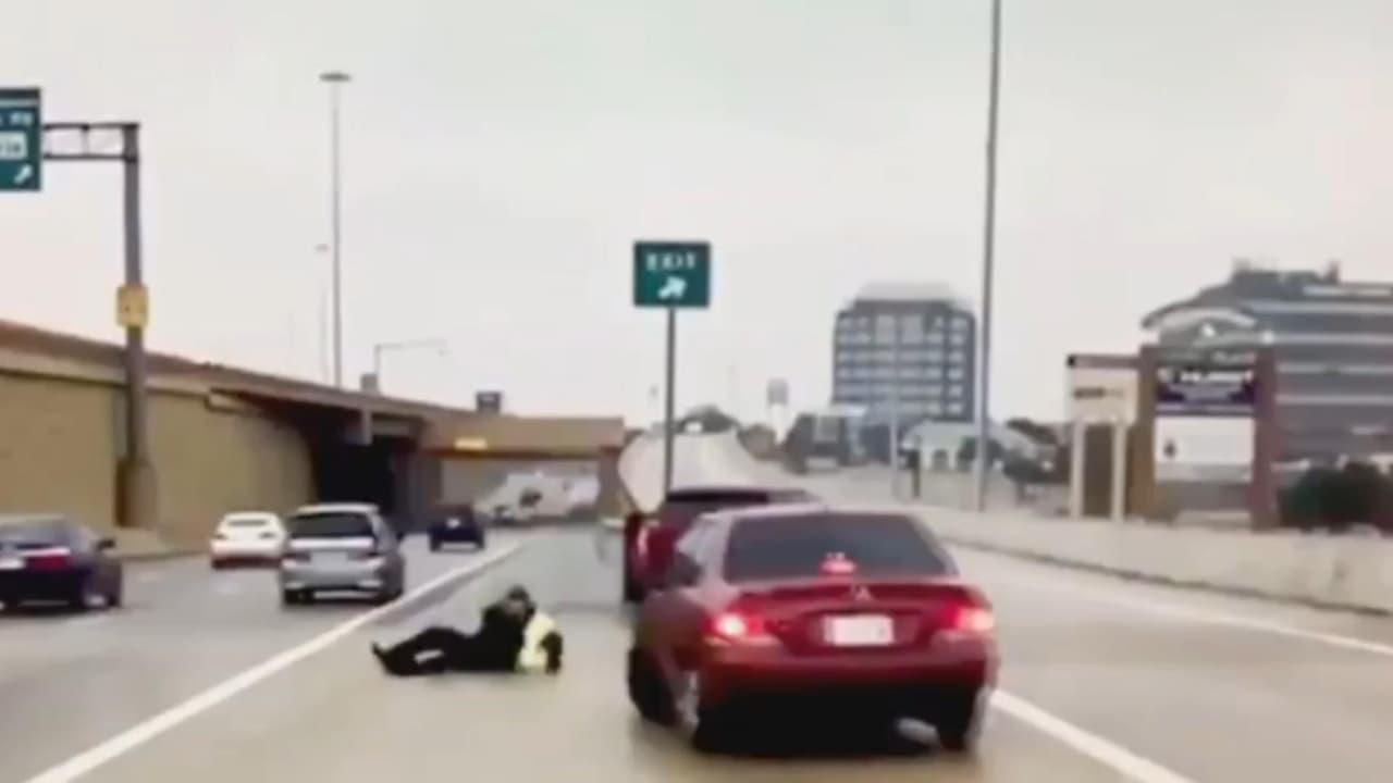 Un oficial de policía en Hurst, Texas, escapó con suerte de ser arrollado por un auto luego de caer al suelo en una carretera helada el pasado 31 de diciembre.