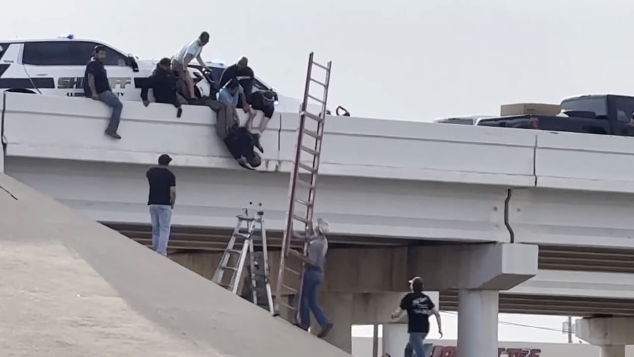 Un oficial queda colgando de un puente elevado luego de que un camión chocara contra su patrulla
