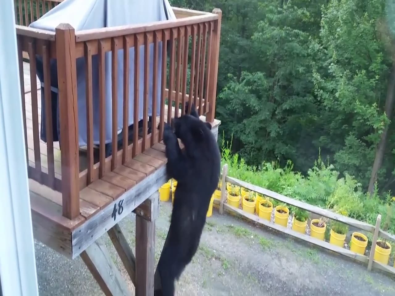 Una familia en Massachusetts recibió la visita de un oso curioso que subió y bajo de un balcón en busca de comida.