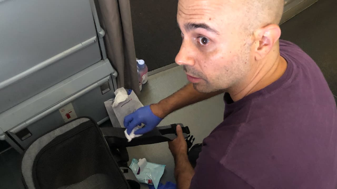 La alfombra se encontraba llena de sangre fresca que comenzó a filtrarse en la mochila del pasajero. El personal de Air France le comentó que un hombre había sufrido una hemorragia en un vuelo anterior y le proporcionaron aditamentos para limpiar.