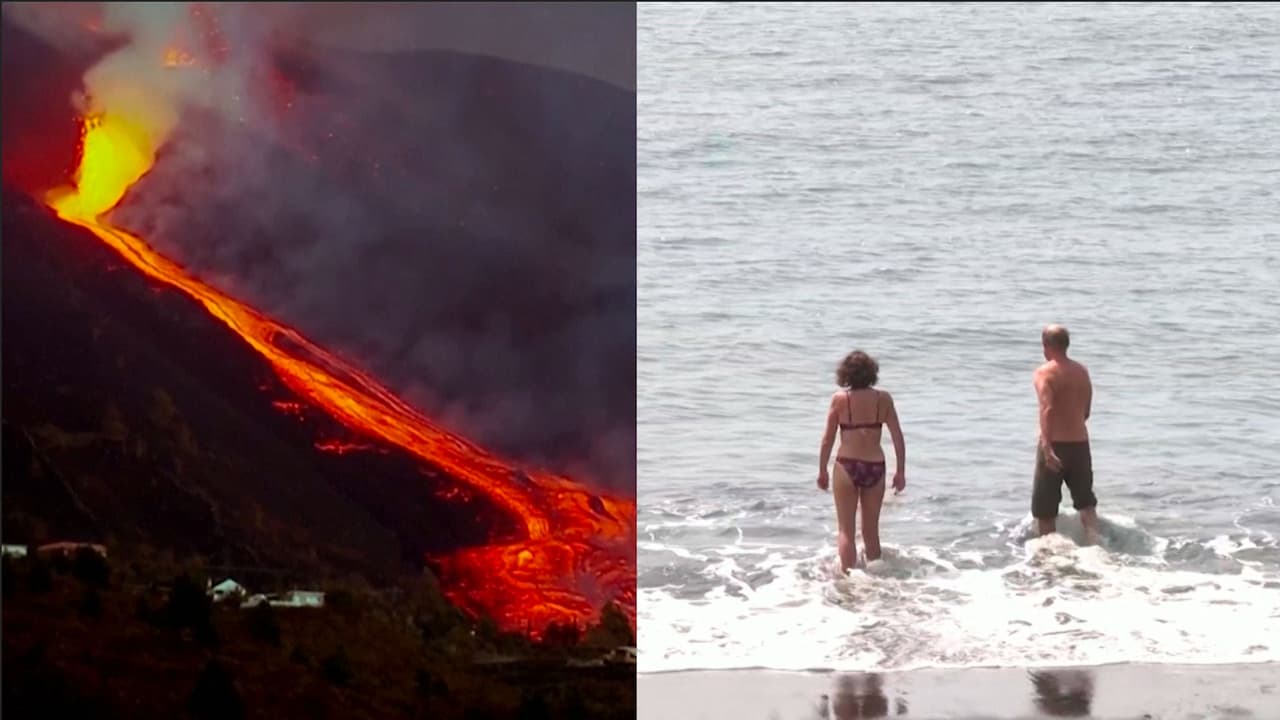 Un peligroso contraste: mientras un volcán arrasa con una isla, estos los bañistas disfrutan de sus playas