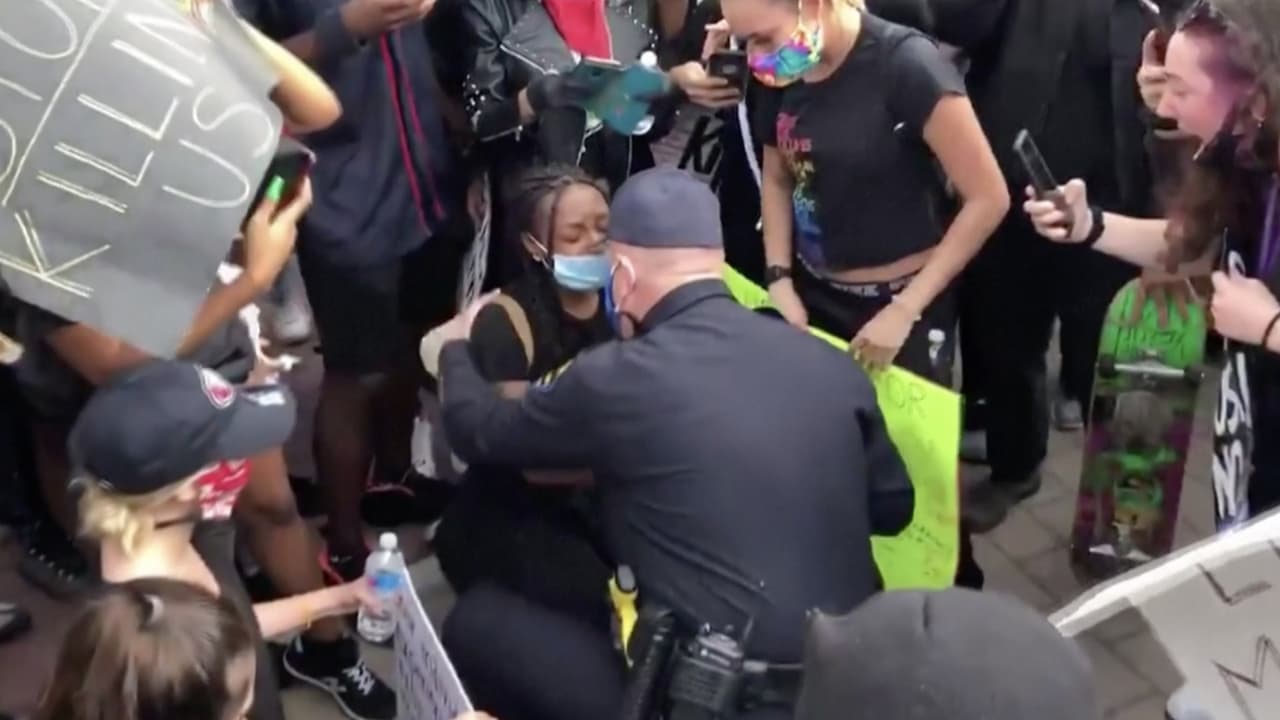 Un policía abraza a una manifestante y otros se unen a la protesta por la muerte de George Floyd