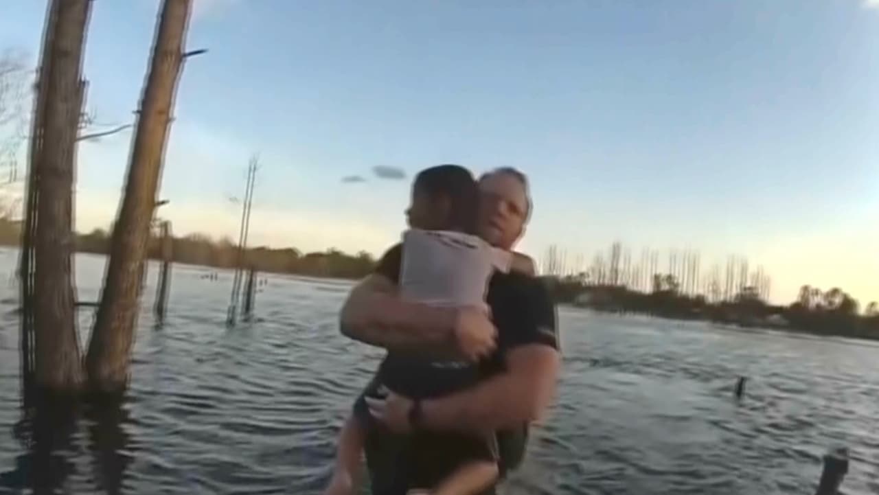 Un sheriff del condado de Volusia en Florida, Wes Brough, encontró al menor de 5 años aferrado a un tronco en un estanque. El momento fue grabado por la cámara corporal del policía.