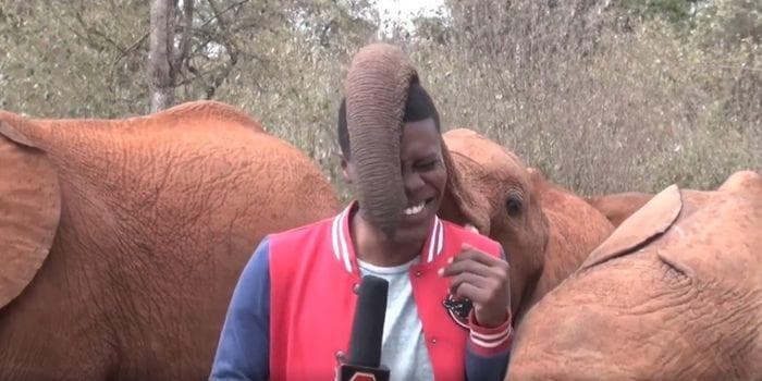 Una bebé elefante sorprende a un reportero en vivo haciéndole cosquillas con su trompa