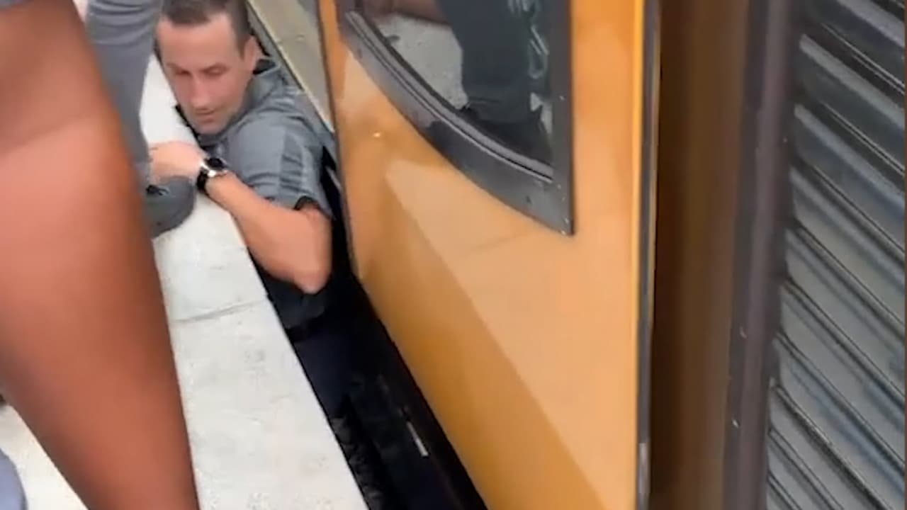 Una bebé se cae debajo de un tren y varios pasajeros tratan de rescatarla