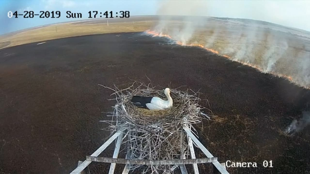 Una cámara instalada junto al nido captó un enorme incendio en Tambovka, Rusia, y cómo la cigüeña estuvo todo el tiempo junto a sus huevos.