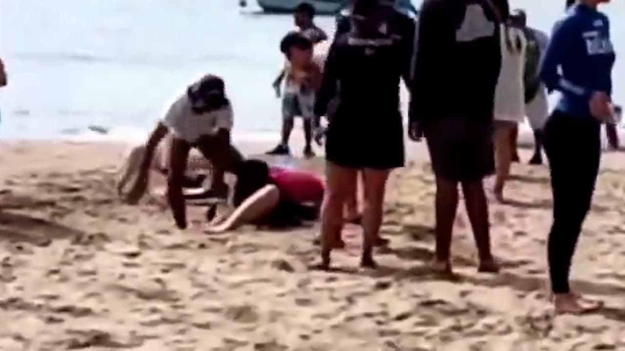 La mujer fue mordida en una extremidad por el animal mientras pasaba un día de descanso en la playa al lado de su pequeño hijo, quien resultó ileso. Sigue las últimas noticias en Univision.