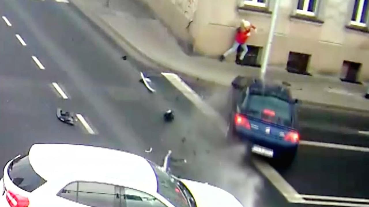 El video captado por cámaras de tránsito muestra el momento en el que un auto pierde el control y se estrella contra un poste de luz, la mujer vestida de rojo cae al suelo luego de pasar un gran susto. El accidente ocurrió en Kalisz en la región central de Polonia.