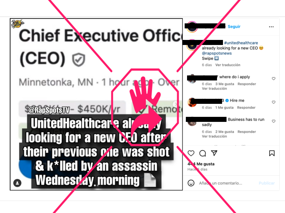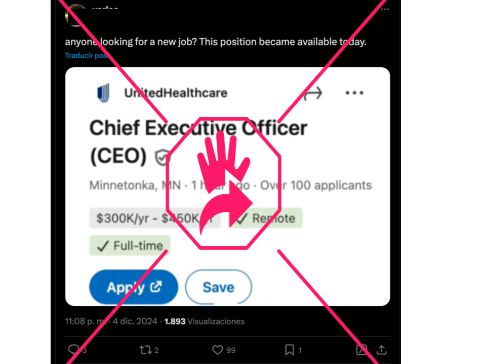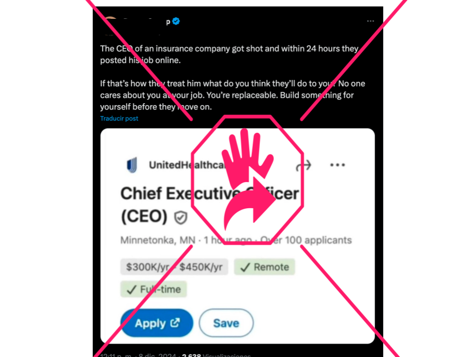 Publicaciones compartidas en Instagram y X ( antes Twitter) aseguran que la compañía aseguradora UnitedHealthcare publicó una oferta de trabajo buscando nuevo CEO el mismo día que su director general, Brian Thompson, fue asesinado, pero esa afirmación es falsa. La empresa confirmó a elDetector que no es cierta. Además, esa oferta no aparece disponible ni en su web ni en su página de LinkedIn en el momento de publicar esta verificación.