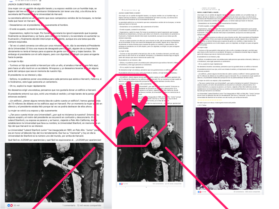 Publicaciones difundidas en redes sociales en abril de 2024 comparten la supuesta historia de cómo los esposos Stanford fundaron la universidad que lleva su nombre, luego de haber recibido un desaire por parte del presidente de la Universidad de Harvard cuando intentaron hacer una donación para construir en ese campus un edificio a nombre de su hijo fallecido. El funcionario les habría rechazado por vestir ropa humilde, según el relato. Sin embargo, todo lo anterior es falso: esta desinformación circula desde hace décadas y fue desmentida ya en 1998 por la Stanford Magazine.