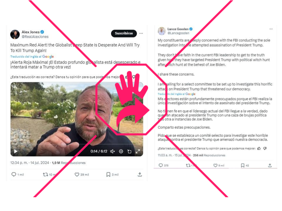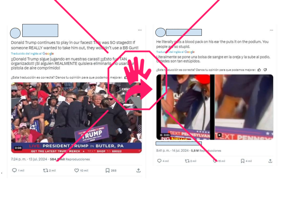 Algunas de estas afirmaciones buscan reforzar la teoría “del montaje de Trump” con falsedades. Por ejemplo, una publicación en X, con 5.8 millones de reproducciones, afirma:“Literalmente [Trump] se pone un paquete de sangre en la oreja y lo pone en el podio. Ustedes son tan estúpidos”. Respecto a esto, Donald Trump confirmó que un disparo le atravesó la parte superior de su oreja derecha, y el caso se maneja como un “intento de asesinato” en contra del expresidente y no como un hecho aislado.