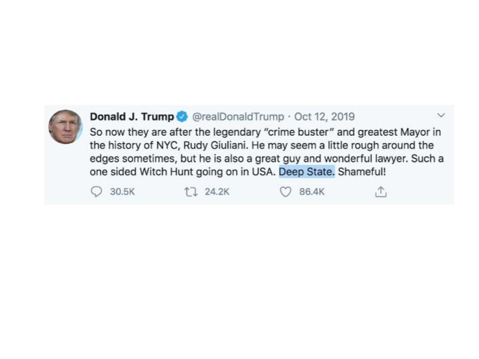 El deep state o estado profundo es una teoría conspirativa, especialmente difundida por los seguidores de QAnon ( movimiento de defensores del presidente Trump), y también mencionada por el exmandatario, al menos, desde 2019.