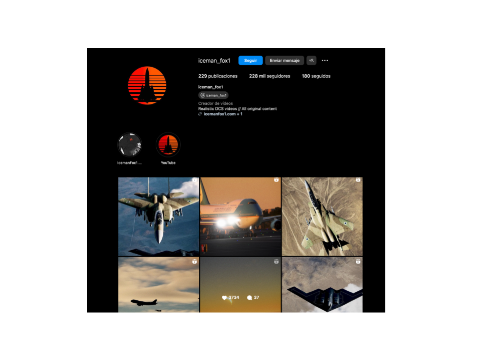 Esa cuenta de Instagram publica contenido relacionado con aeronaves y aviones de combate y es, según se lee, de un creador de videos. La biografía dice, en inglés: “Videos realistas de DCS // Todo el contenido es original”. DCS son las siglas en inglés de Digital Combat Simulator (simulador digital de combate), un videojuego cuya descripción explica que ofrece “la simulación más auténtica y realista posible de aviones, tanques, vehículos terrestres y barcos militares”.