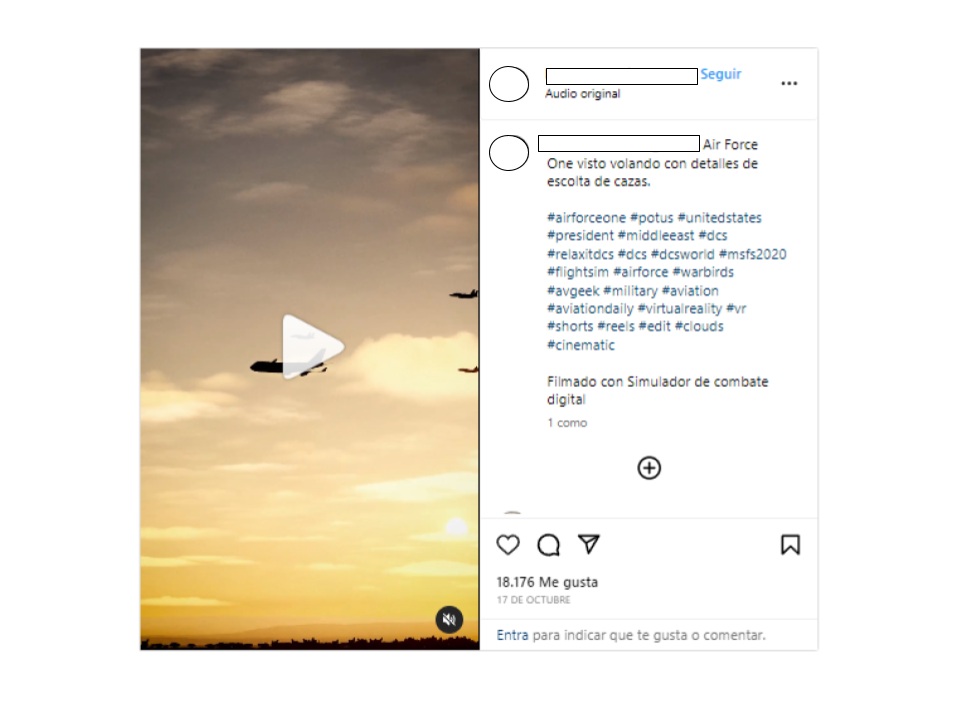 Si bien en el texto que acompaña ese video en Instagram, que es exactamente el mismo que estamos verificando acá, señala que se trata del “Air Force One volando con escolta de cazas”, también añade “filmado con simulador de combate digital”, junto a las etiquetas, en inglés, de “realidad virtual" y de "DCS” (las siglas del videojuego).
