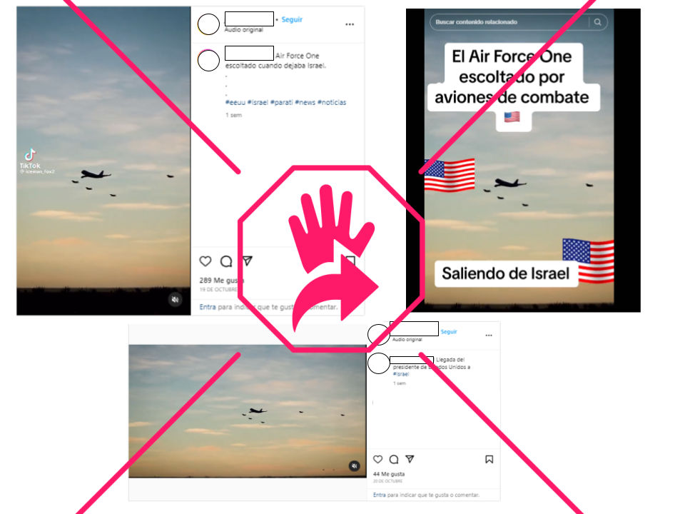 Es falso que ese video en el que se ve un avión de grandes dimensiones, escoltado por otros más pequeños, sea el Air Force One saliendo de Israel tras la más reciente visita del presidente Joe Biden a ese país, como afirma una publicación en Facebook. La grabación es una creación digital hecha con un videojuego. Lo comprobamos con una búsqueda inversa de imágenes en Google que nos condujo a varios posts en redes sociales que reproducen el mismo clip, uno de los cuales en Instagram no solamente fue difundido un día antes de la visita del mandatario estadounidense, sino que es de una cuenta de un usuario que se identifica como creador de videos y que, según dice, publica solamente contenidos originales de “videos realistas de DCS”, siglas del videojuego de simulación digital de combate. Lee aquí cómo escogemos y asignamos nuestras etiquetas en elDetector.