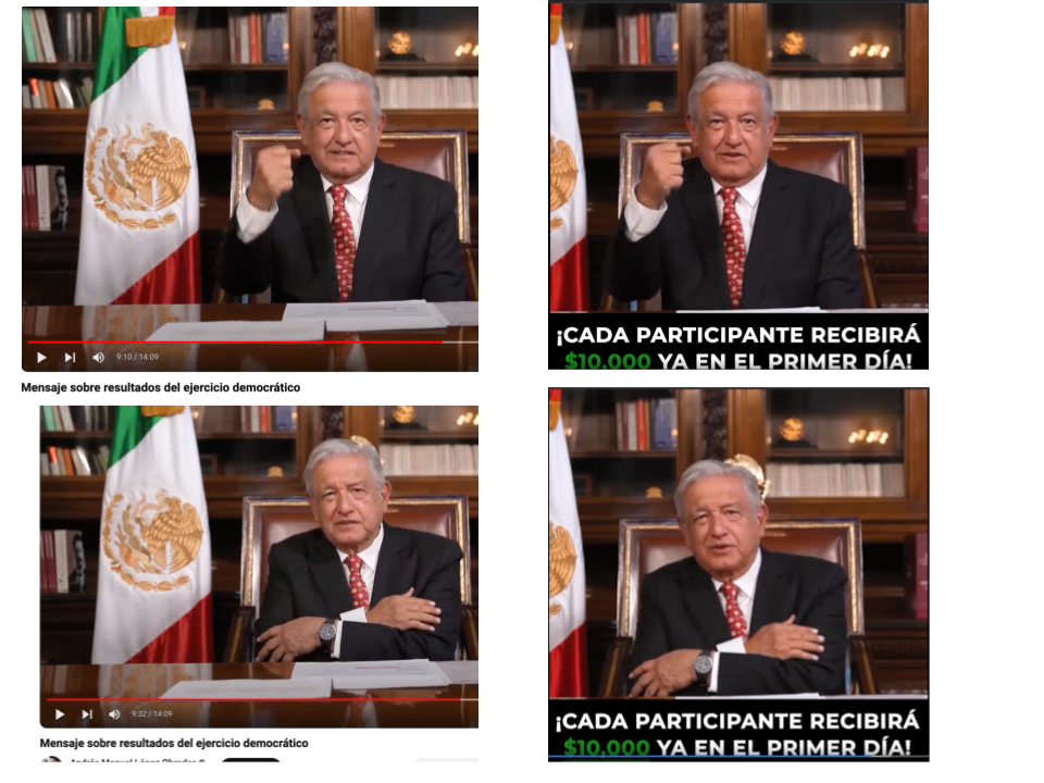 La grabación supuestamente muestra a AMLO diciendo que ahora que su mandato llega a su fin compartirá un secreto que solo conocerán 100 personas, que “resolverá tus problemas financieros” y “te permitirá dejar de trabajar”. Posteriormente presenta un presunto programa basado en inteligencia artificial que promete ganancias sin necesidad de habilidades especiales.