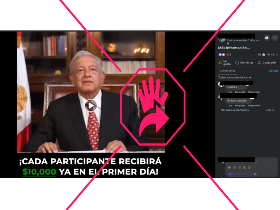 “¡Cada participante recibirá 10,000 ya en el primer día!”, dice una frase sobrepuesta a un video de casi 10 minutos en el que aparece el expresidente López Obrador hablando desde una oficina y vestido con un traje negro, una camisa blanca y una corbata roja con motivos verdes y blancos. Al fondo se ve una bandera de México y una biblioteca.