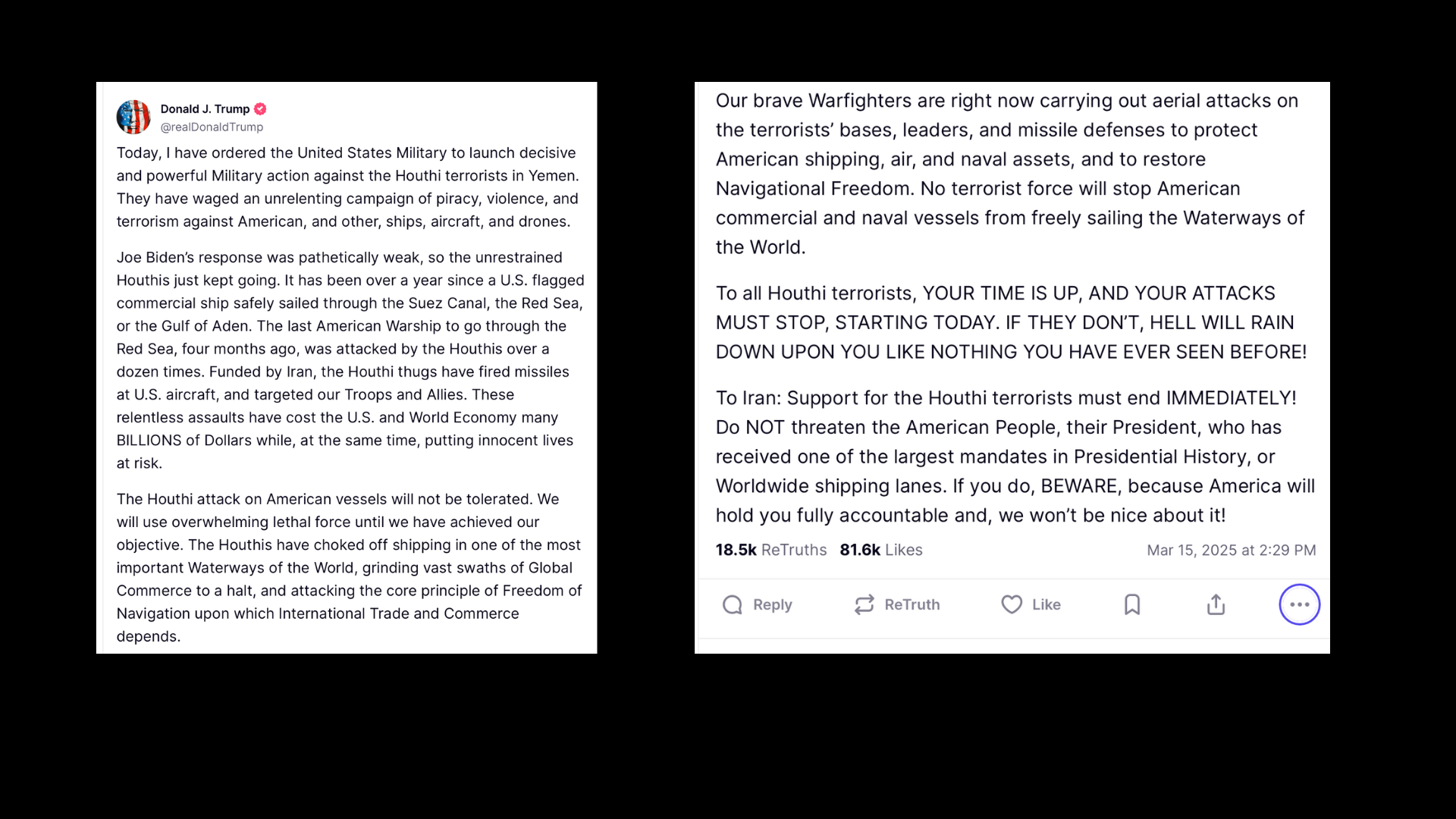 En la grabación publicada el 16 de marzo de 2025 y titulada “Escalada en el Mar Rojo: Houthis [sic] atacan al USS Harry S. Truman”, se escucha una voz en árabe que dice: “A las seis encontramos la cooperación estadounidense-israelí. Intentando restaurar. Dios. Observamos que no fue así”. Además, el texto que la acompaña informa sobre un ataque del grupo rebelde el 15 de marzo de 2025 contra el portaviones USS Harry S. Truman.
