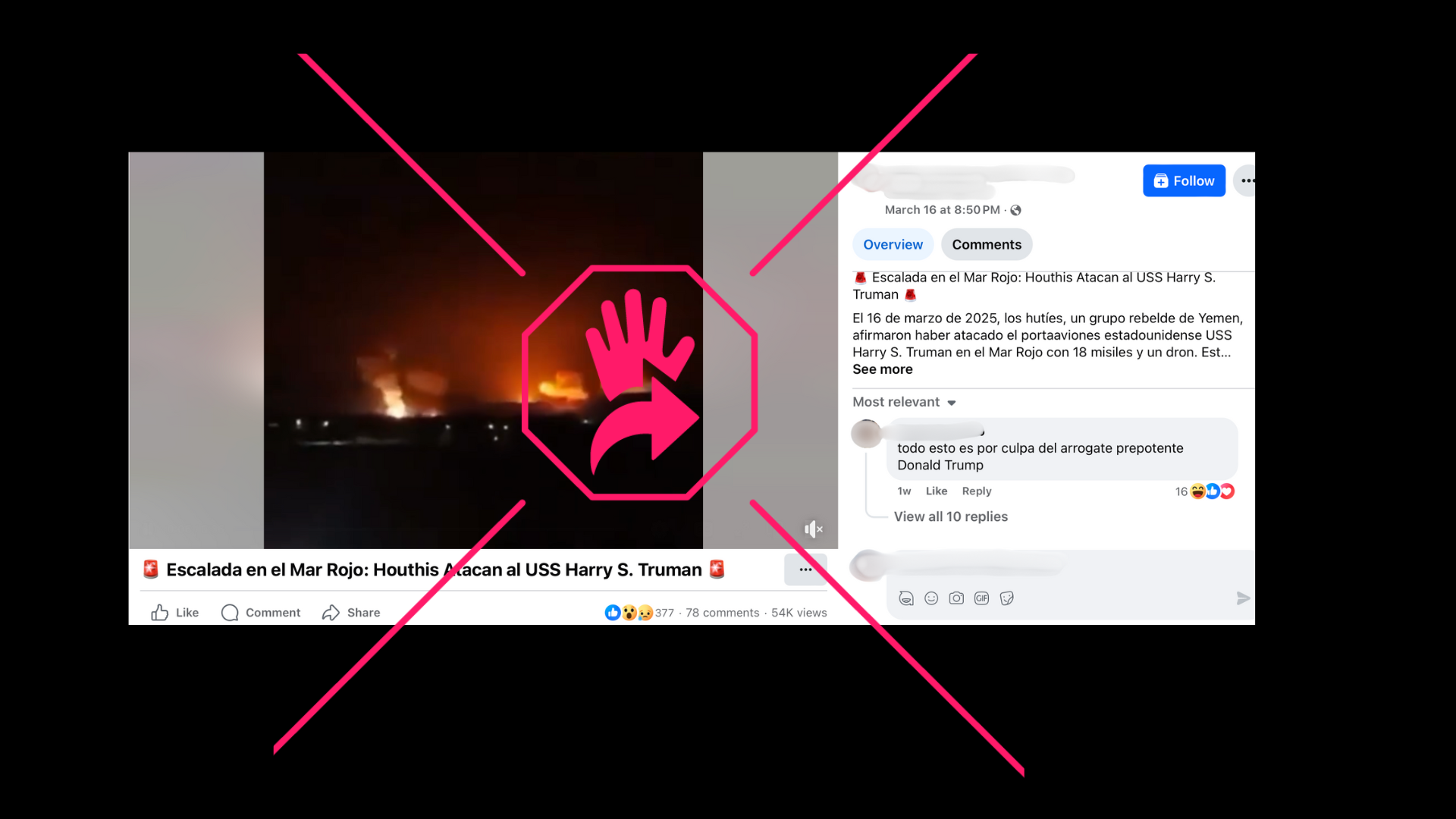 Una publicación difundida en Facebook lleva un video que supuestamente muestra un ataque de los hutíes (grupo de rebeldes respaldados por Irán) contra el portaviones estadounidense USS Harry S. Truman en marzo de 2025, en medio de la ofensiva ordenada por el presidente Donald Trump contra zonas controladas por ese grupo en Yemen. Pero esa afirmación es falsa: las imágenes corresponden a un ataque de Estados Unidos y el Reino Unido contra los hutíes en 2024, cuando Trump no era presidente, por lo que el video está fuera de contexto.