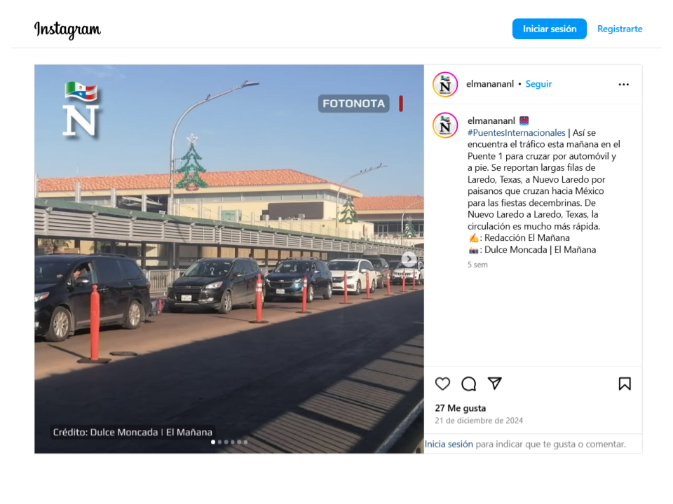 Una búsqueda con palabras clave en Google nos llevó a una publicación en la cuenta de Instagram del medio El Mañana de Nuevo Laredo , un periódico regional, que el 21 de diciembre de 2024 publicó una fotogalería del tráfico que había ese día en la vía a los Puentes Internacionales de México. “Así se encuentra el tráfico esta mañana en el Puente 1 para cruzar por automóvil y a pie. Se reportan largas filas de Laredo, Texas, a Nuevo Laredo por paisanos que cruzan hacia México para las fiestas decembrinas. De Nuevo Laredo a Laredo, Texas, la circulación es mucho más rápida”, se lee.