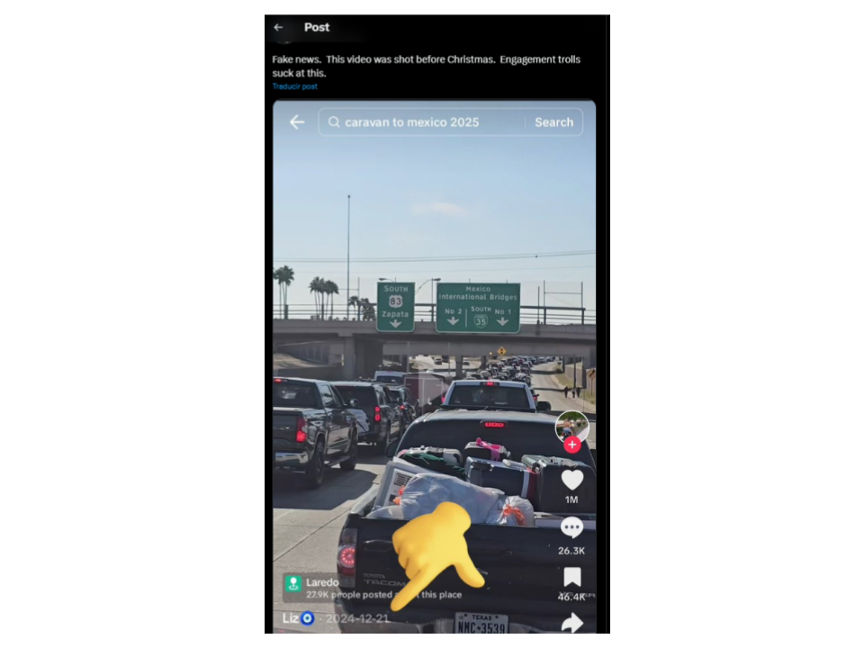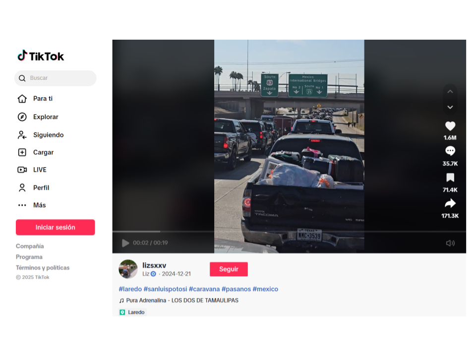 Con una búsqueda en Google con el nombre del usuario que posteó en TikTok el video el 21 de diciembre de 2024, dimos con la grabación original que, efectivamente, tiene esa fecha, y que en la descripción dice: “#laredo #sanluispotosi #caravana #pasanos [ sic] #mexico”. El video es de un mes antes de que Trump asumiera la presidencia y en la descripción no se menciona por ninguna parte que son personas regresando por las políticas migratorias o por las deportaciones masivas, como se afirma en mensajes de Facebook e Instagram.