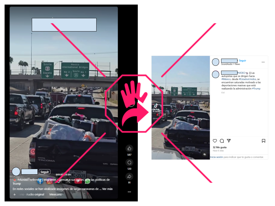 “Migrantes regresan a sus países por las políticas de Trump”, “Las autopistas que se dirigen hacia México, desde EEUU, se encuentran saturadas motivado a las deportaciones masivas que está realizando la administración Trump”, se lee en mensajes de Instagram y Facebook, acompañados de un video en el que se ven decenas de carros, en fila, saturando una carretera cuyas señalizaciones indican vías hacia South Zapata (Laredo, Texas) y los puentes internacionales de México, según dicen en inglés los avisos.