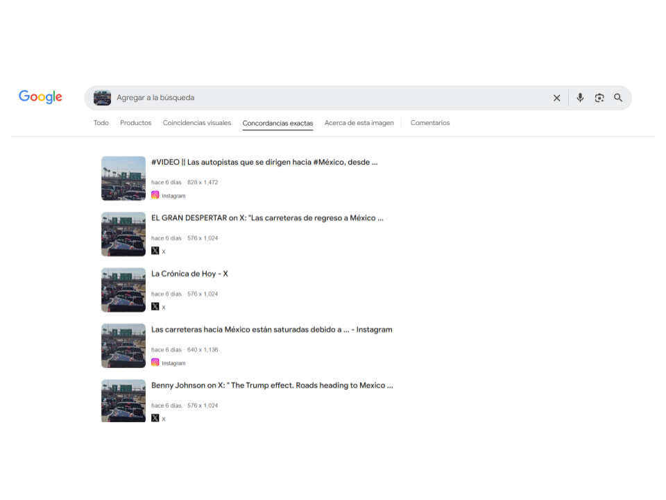 Una búsqueda inversa de imágenes en Google Lens, a partir de una captura de pantalla del video, nos llevó, entre varios resultados, a una cuenta en X (antes Twitter) que desmiente que los carros atascados en el tráfico vayan de regreso a México por las políticas migratorias. El usuario en X muestra la fecha de captura del video, en el que se lee 21 de diciembre de 2024. Esos datos provienen de una cuenta en TikTok.