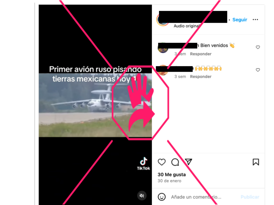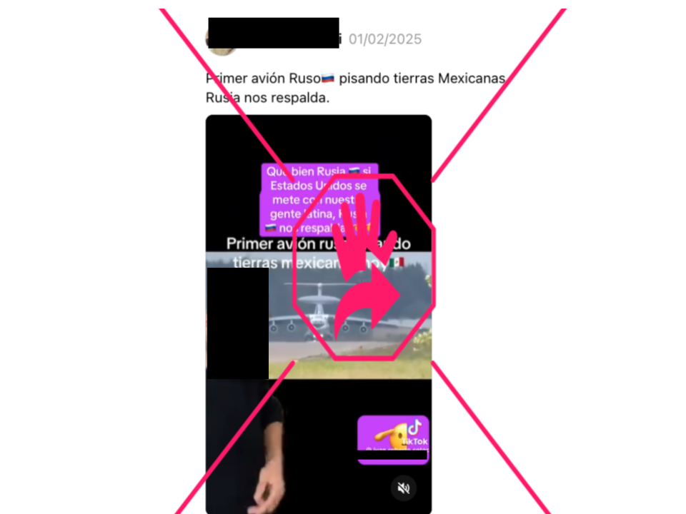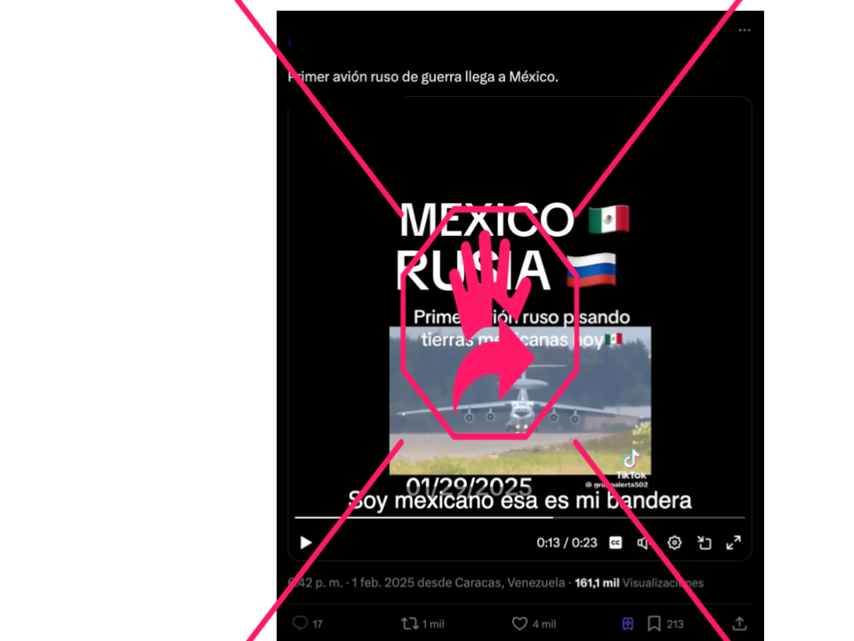 “Primer avión ruso pisando tierras mexicanas hoy”, dice un mensaje superpuesto al clip del avión en movimiento publicado en Instagram el 30 de enero de 2025 y en X (antes Twitter) el 1 de febrero de 2025. Otra publicación en Threads, también del 1 de febrero de 2025, añade: “Qué bien Rusia. Si Estados Unidos se mete con nuestra gente latina, Rusia nos respalda”.