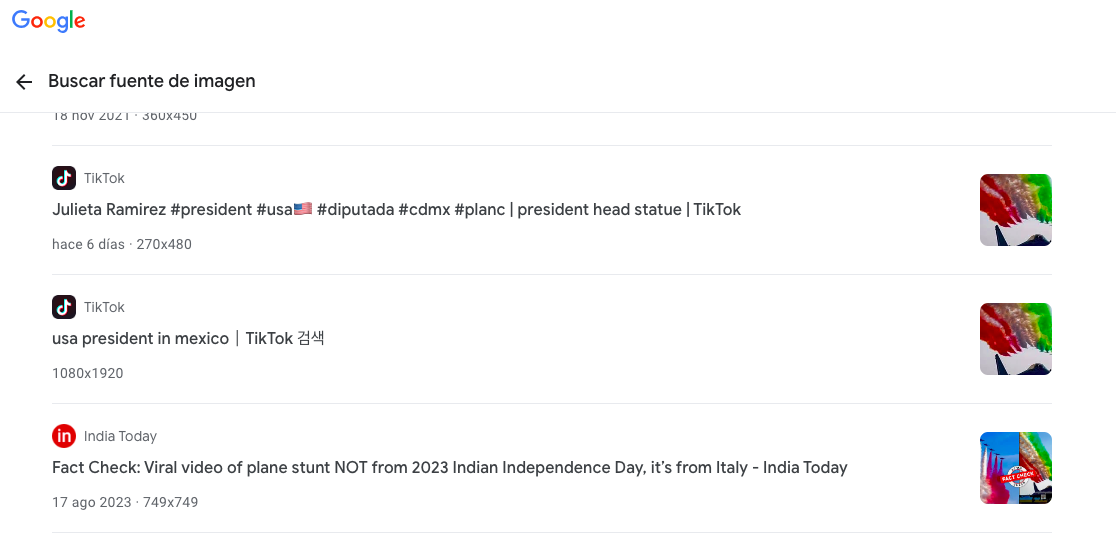 En elDetector hicimos una búsqueda inversa de imagen en Google con una captura de pantalla del video y arrojó como resultado una verificación hecha por India Today (miembro, como elDetector, de la International Fact-Checking Network) en agosto de 2023, que desmiente que la grabación que estamos chequeando corresponda a las celebraciones por la independencia de India y señala también que la maniobra fue captada en Italia.