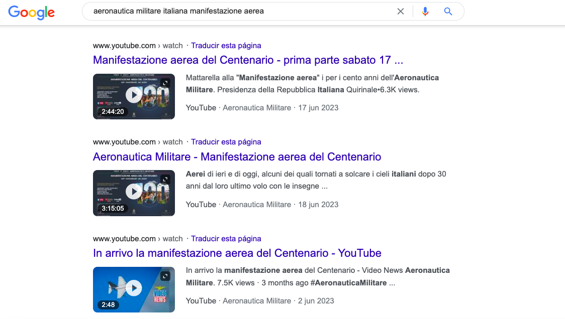 En la versión más viral del video en TikTok, sin embargo, un usuario advierte que la grabación es “en Italia”, por lo que en elDetector seguimos esa pista e hicimos una búsqueda por palabras clave en Google en italiano (aeronáutica militar italiana demostración aérea) y encontramos varios videos con espectáculos hechos en los últimos meses en Italia con ocasión del centenario de la fuerza aérea de ese país.