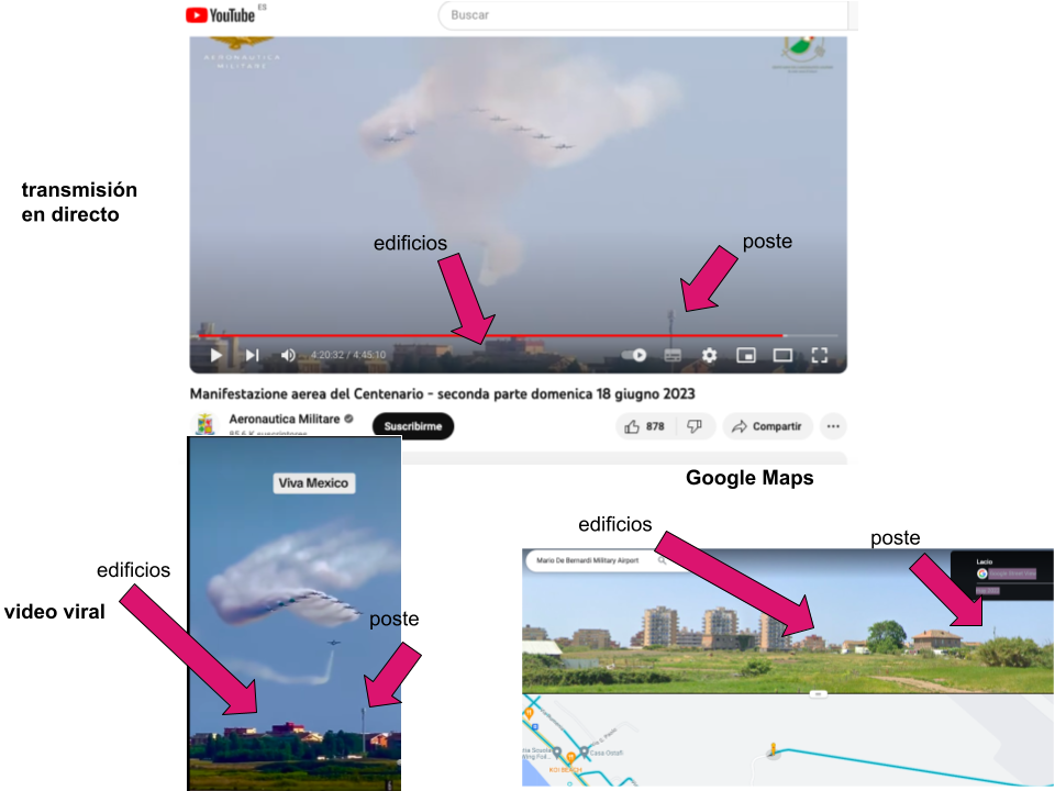Aunque la grabación no es idéntica, en un punto del video, cuando el décimo avión se dispone a elevarse frente a los nueve que luego desplegarán los colores de la bandera, se pueden distinguir al fondo los mismos edificios y el mismo poste que se ve en la grabación objeto de esta verificación. Además, estos también son reconocibles en el Google Street View. Por tanto, queda claro que todas las imágenes fueron grabadas en el aeropuerto italiano Mario De Bernardi.