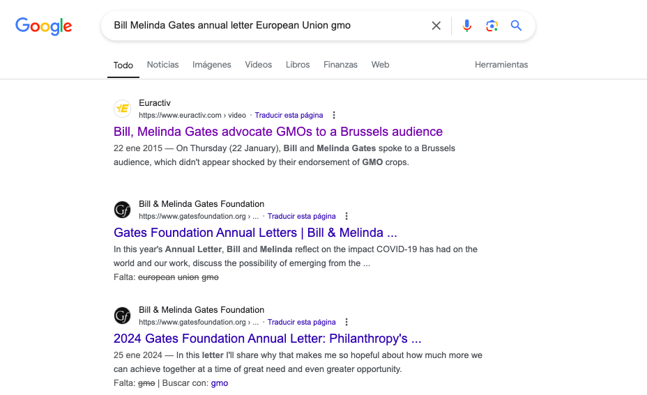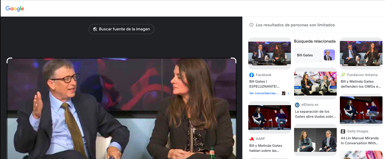 En elDetector hicimos una búsqueda inversa de imagen en Google Lens a partir de una captura de pantalla del video y encontramos una nota publicada el 27 de enero de 2015 en el sitio web de una fundación especializada en nuevas tecnologías en la agricultura. El texto se titula “Bill y Melinda Gates defienden los OMGs [organismos genéticamente modificados] en su visita a Bruselas” y va acompañado de una imagen en la que aparece la pareja y que coincide con la del clip que estamos verificando.